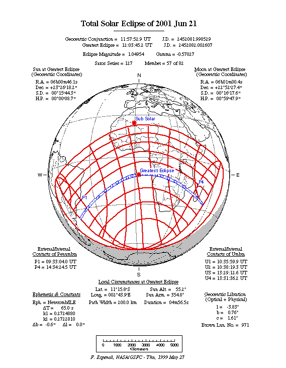 في الثامن و العشرون من شهر ربيع الاول 1422 الموافق 21 حزيران - يونيو 2001 يحدث كسوف كلي للشمس قابل للرؤية في شرق امريكا الجنوبية ، المحيط الاطلسي، مركز و جنوب قارة افريقيا من الساعة 12:33:04 بتوقيت مكة المكرمة حتي الساعة 17:34:24 بتوقيت مكة المكرمة