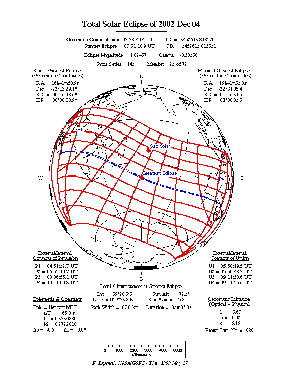 في الثامن و العشرون من شهر رمضان المبارك 1423 الموافق 4 كانون الاول 2002 يحدث كسوف كلي للشمس قابل للرؤية في وسط و جنوب قارة افريقيا ، القطب الجنوبي و غرب استراليا من الساعة 9:50 بتوقيت مكة المكرمة   حتي الساعة 12:12 بتوقيت مكة المكرمة